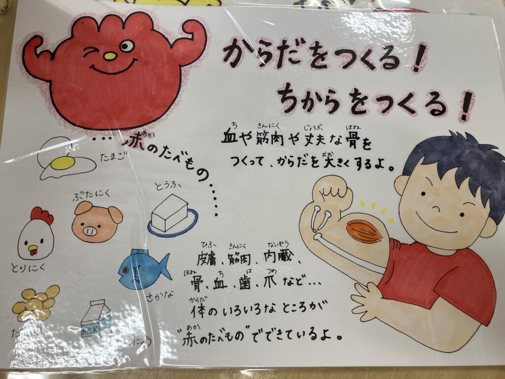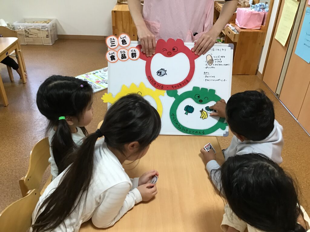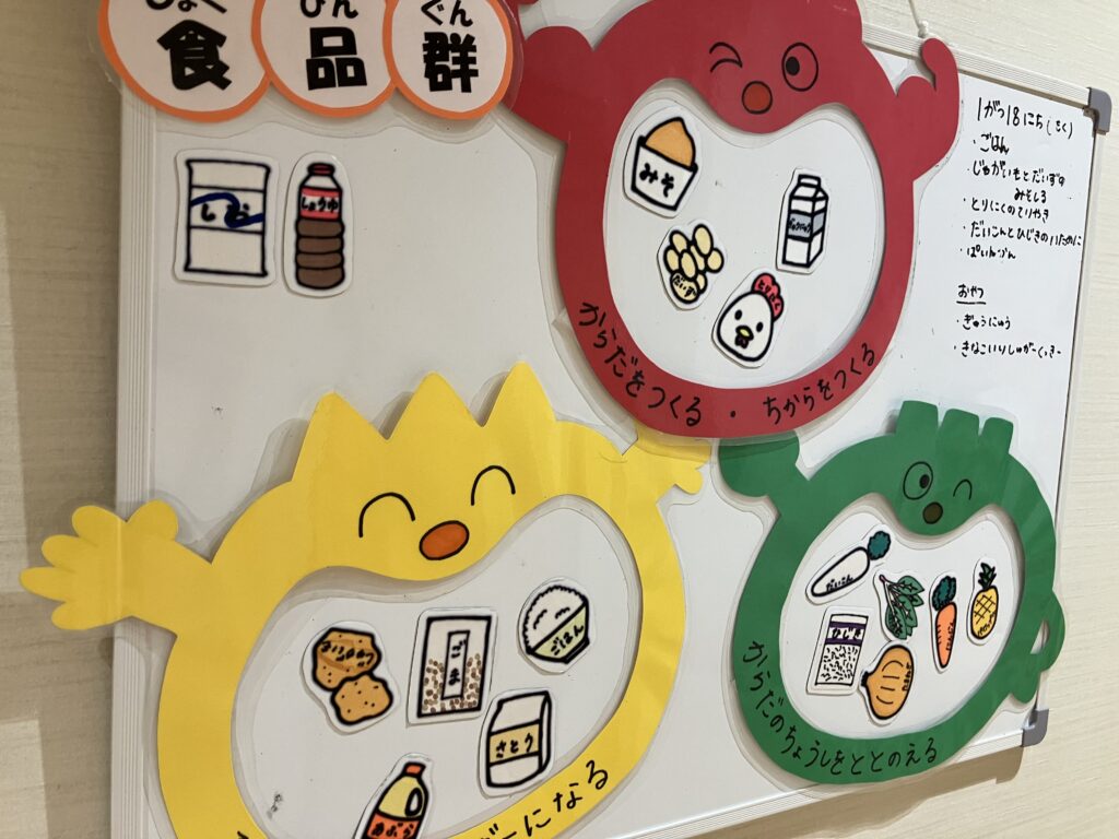廊下に掲示している三食食品群の食材マグネットは、毎日きりん組が貼っています。