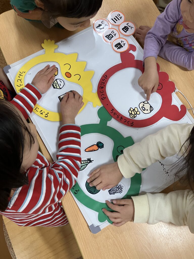 「分からなーい。」「間違えたくないから貼れない…」と言う子もいましたが、同じテーブルの友だちに相談しながら、配られた全てのマグネットを貼っていきます。