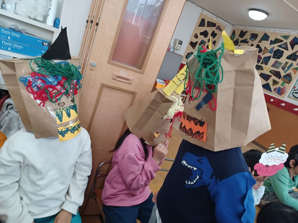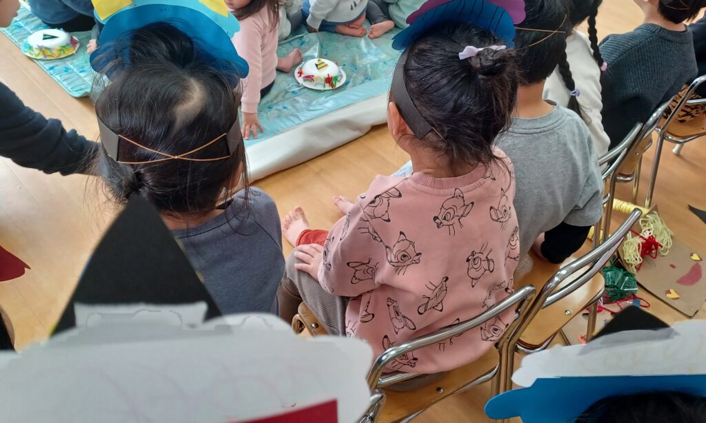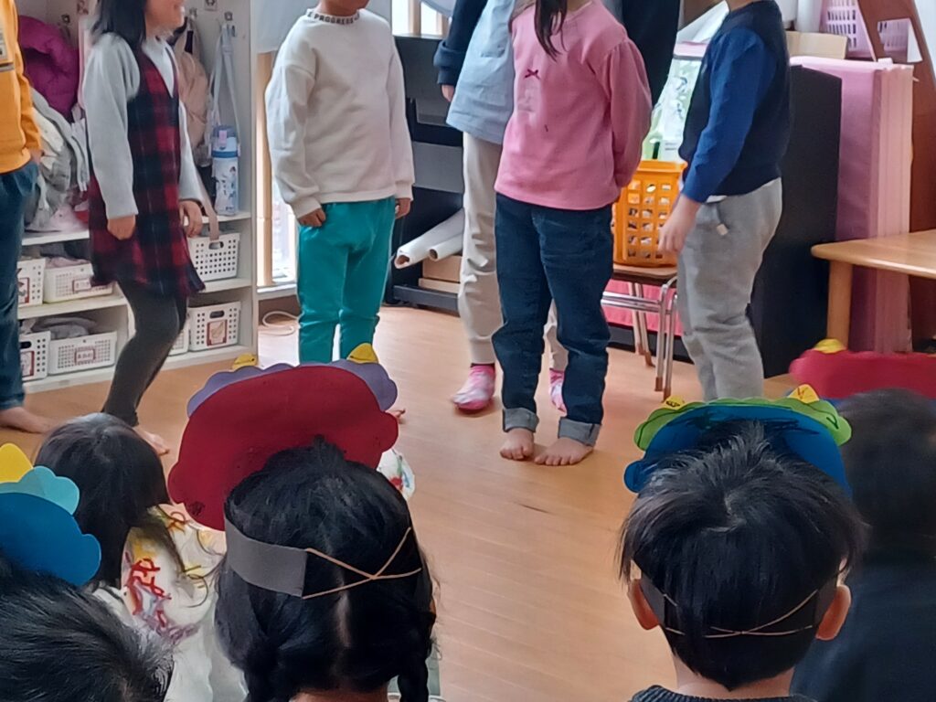 自分たちで作成した鬼の帽子やお面をつけて、2歳児クラスから5歳児クラスの子どもたちが幼児保育室に集まりました!