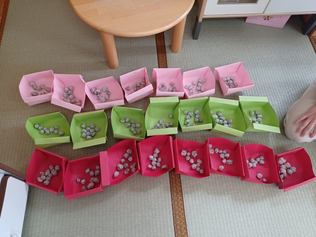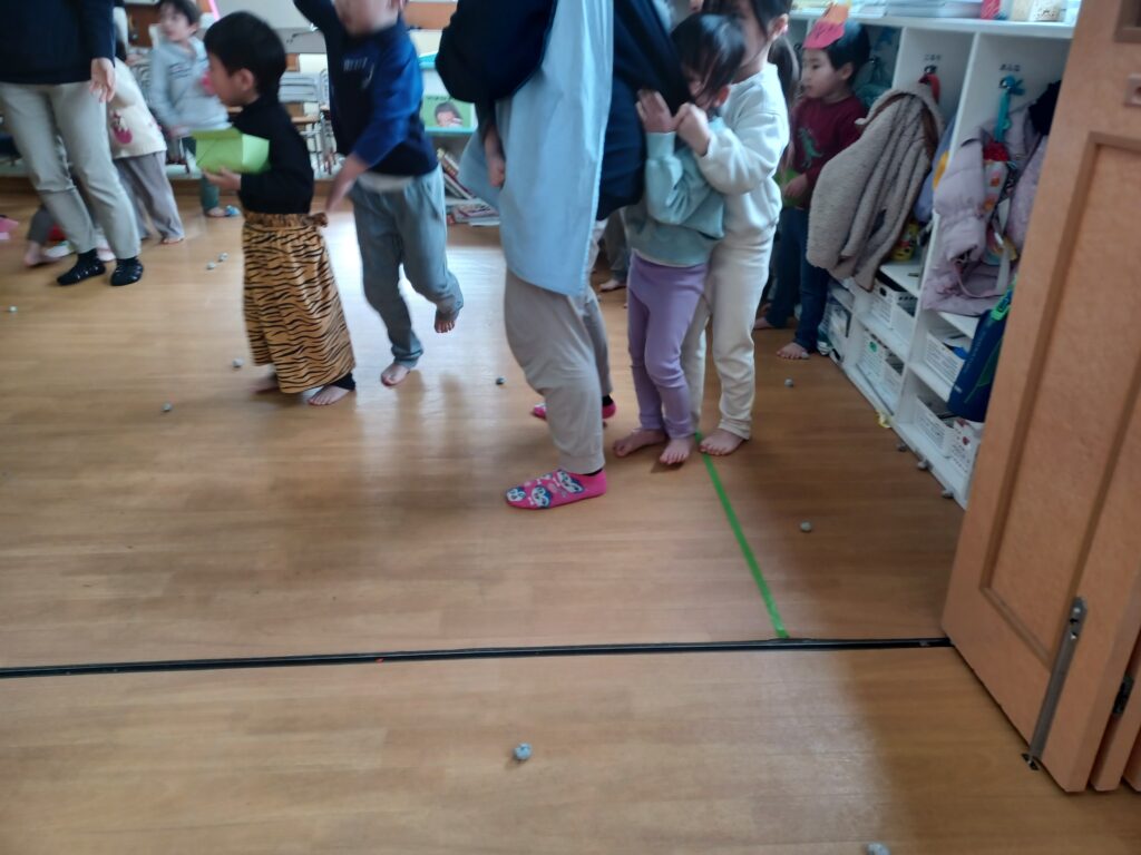 豆まきで使用した豆は5歳児クラスの子どもたちが新聞紙で作成しました!