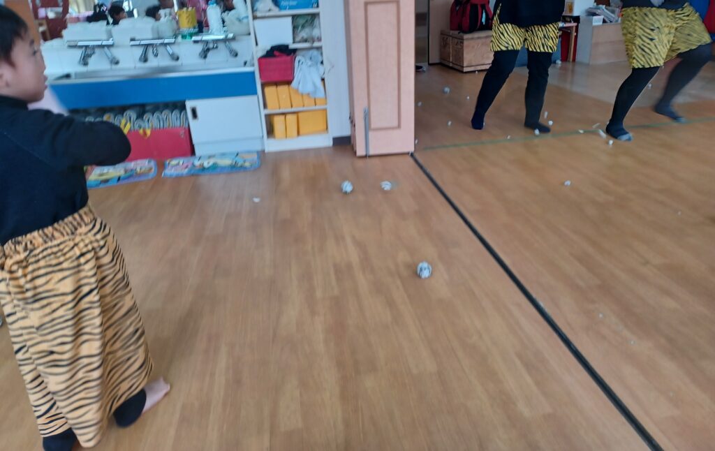 そこに向かって、「おにはーそと」とカラーボールをくっつけ、鬼退治しています。