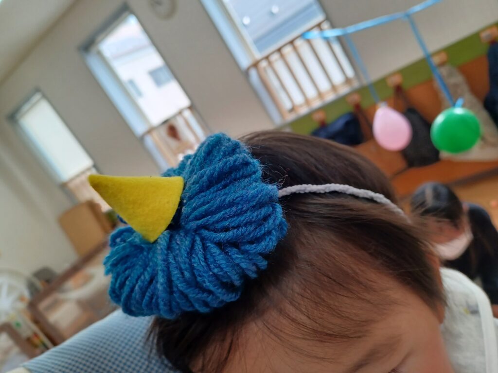 0歳児クラスの鬼の帽子は担任の手作りの角です。