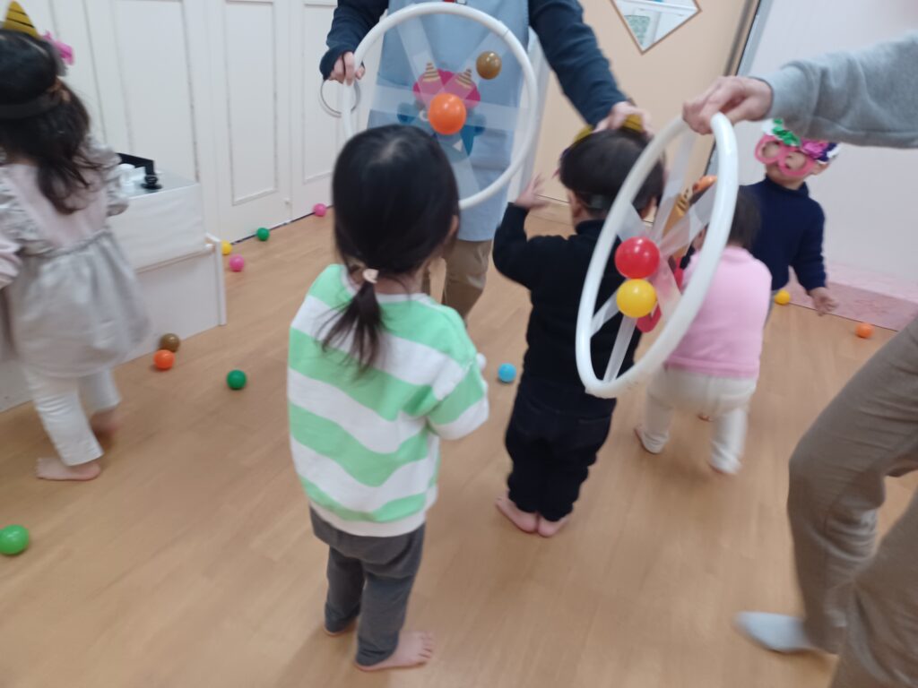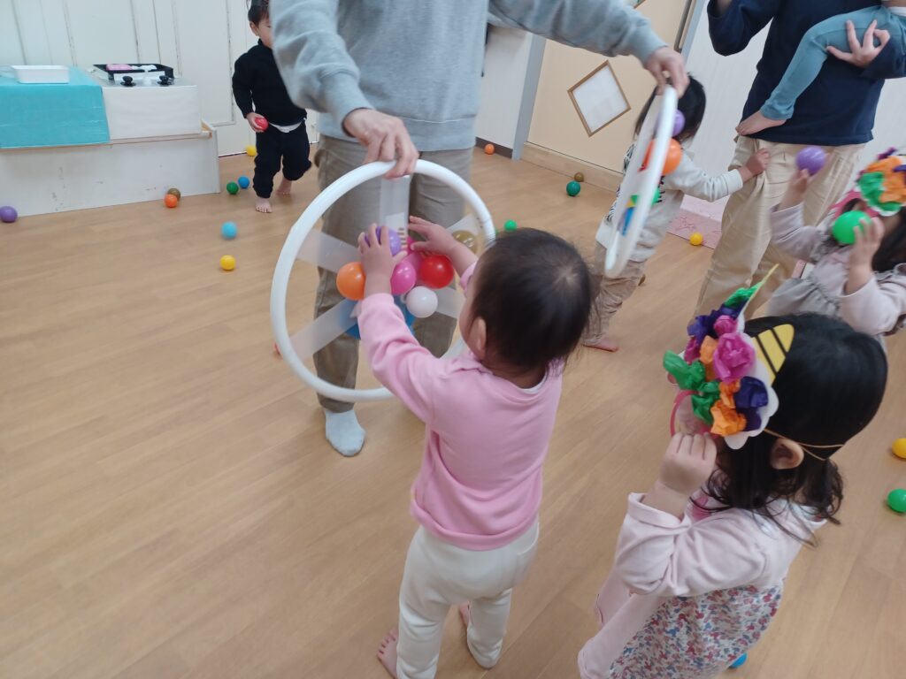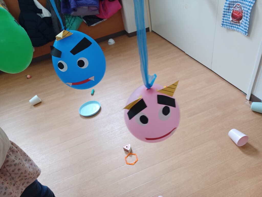 カラーボールを豆に見立てて、豆まきをしたり、直接風船に触り、鬼退治しました!
