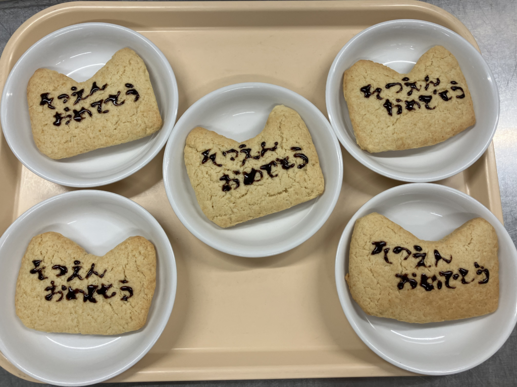 5歳児はもうすぐ卒園ということでネコ型クッキーに卒園祝いのメッセージを1人1人に名前を書いて特別感を出しました♪