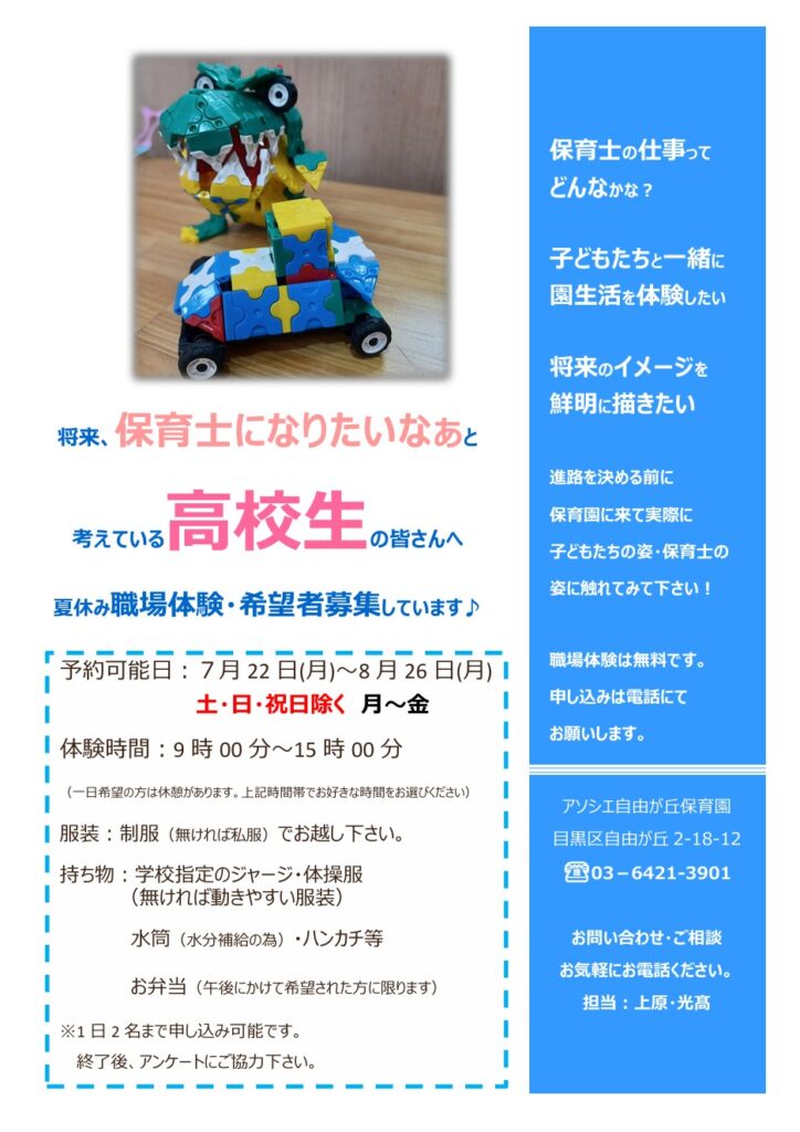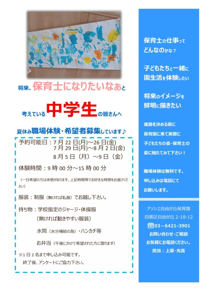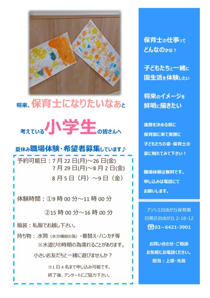 夏休みの期間中に小学生・中学生・高校生の皆さまを対象とした「保育園職場体験」を実施いたします。