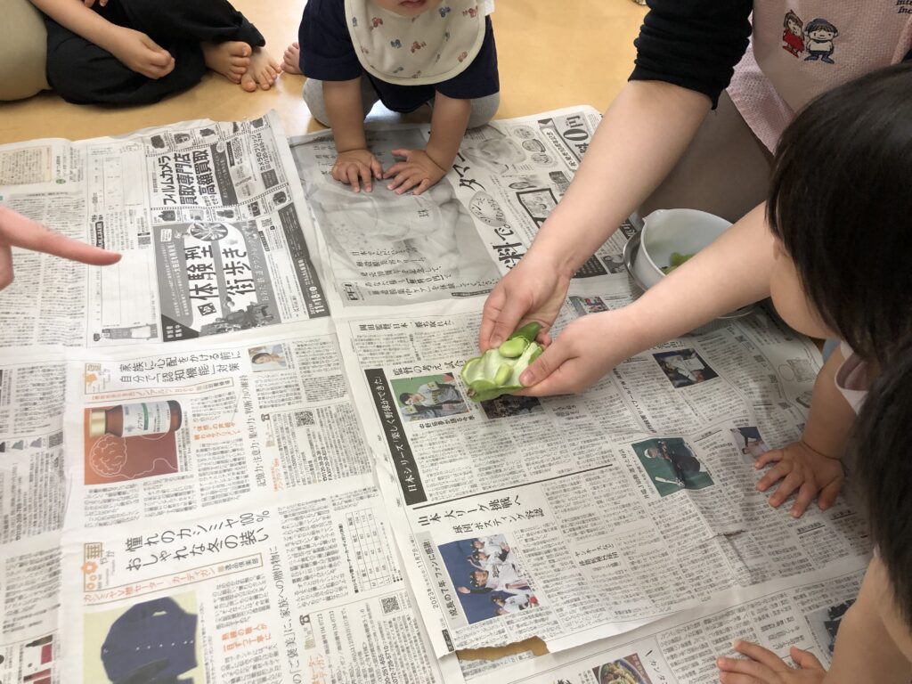 前日に作ったそら豆の製作を指さしながら「あれと一緒!」と言いながら食べる子もおり、絵本や製作物とリンクしてきたことにも成長を感じることができました。