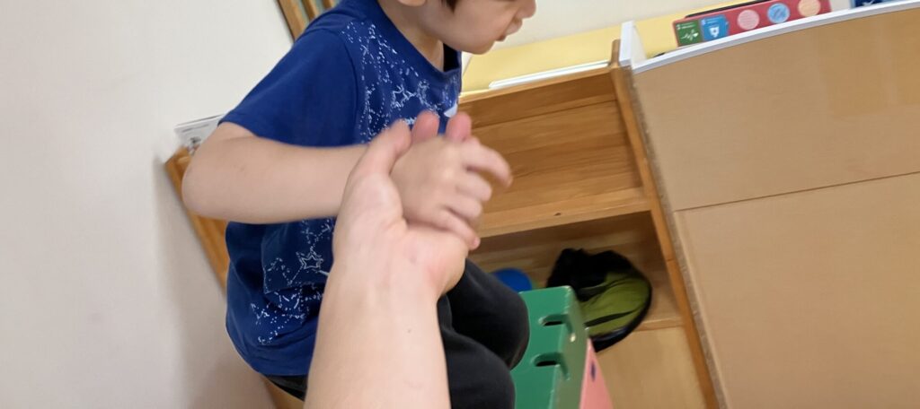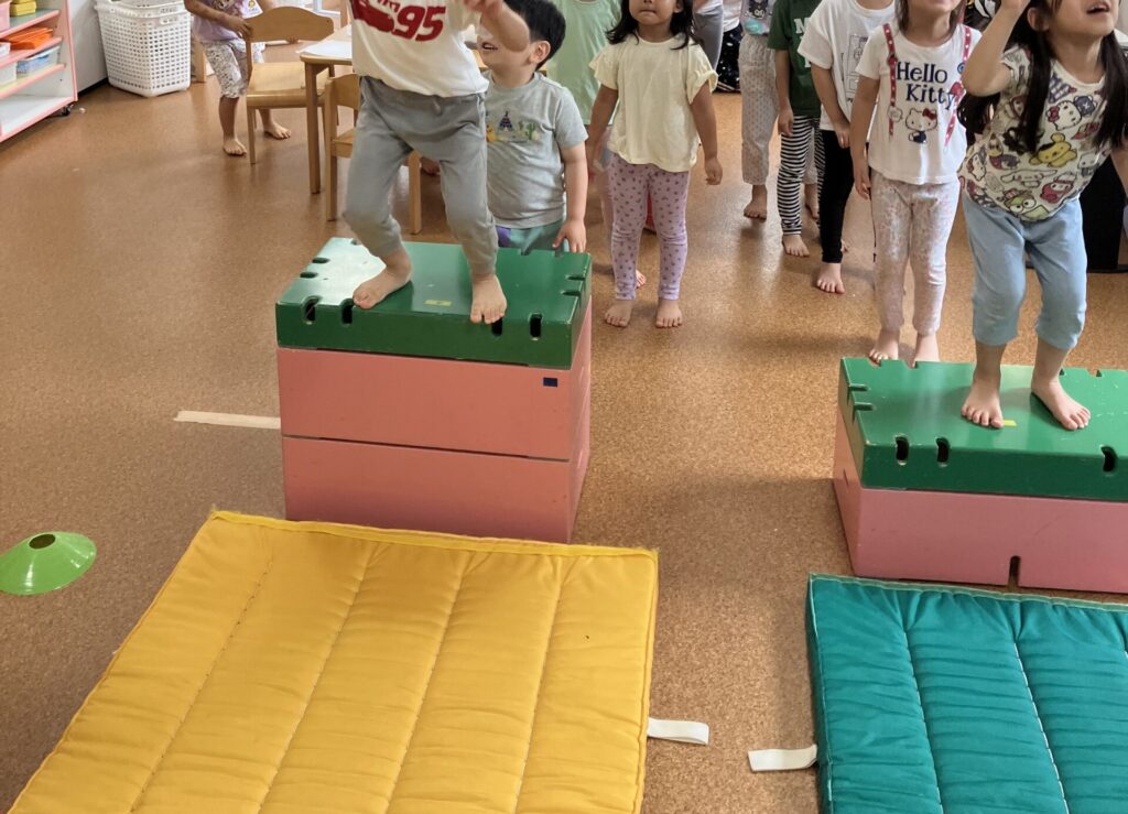 と話していたので、巧技台を用意して、高い所からジャンプする遊びを提案しました。