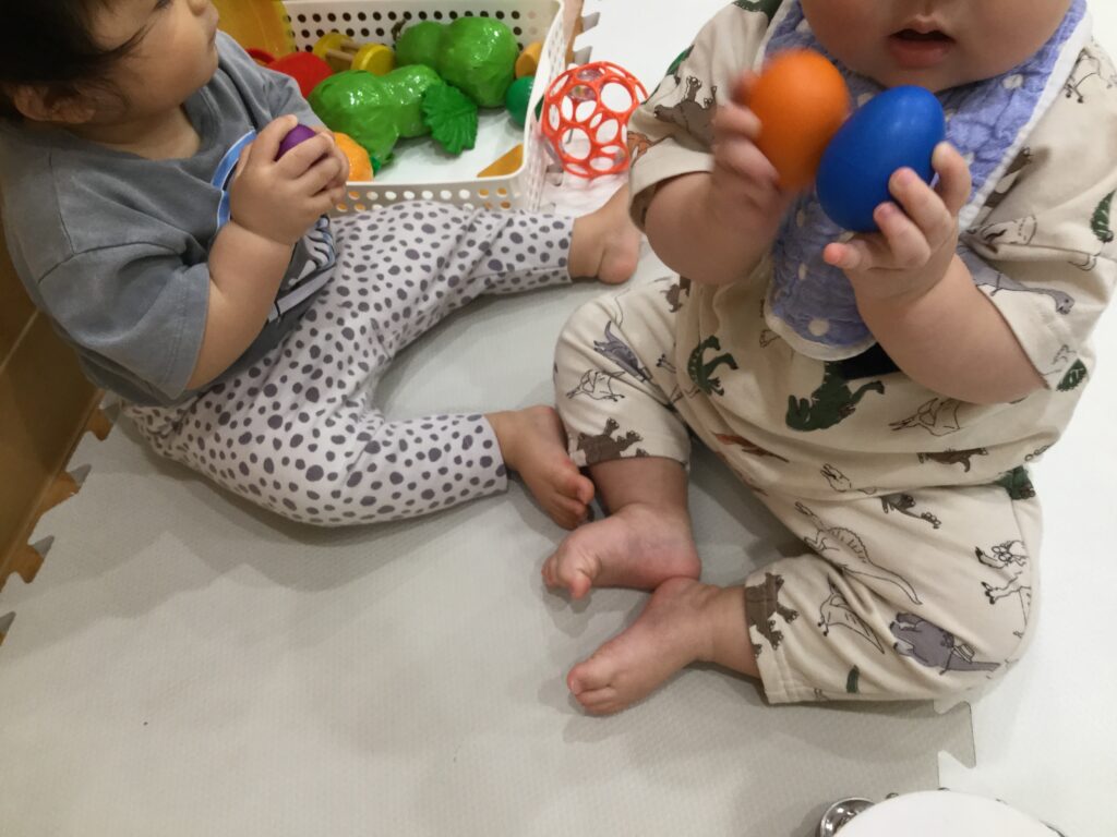 0歳児(ひよこ組)の室内遊びの様子を紹介します。音の鳴る玩具や歌が大好きな子どもたち。保育者が歌を歌う時やCDで音楽が流れると、身体を揺らしたり、持っていた玩具を振ったりしてノリノリで楽しんでいる姿があります。