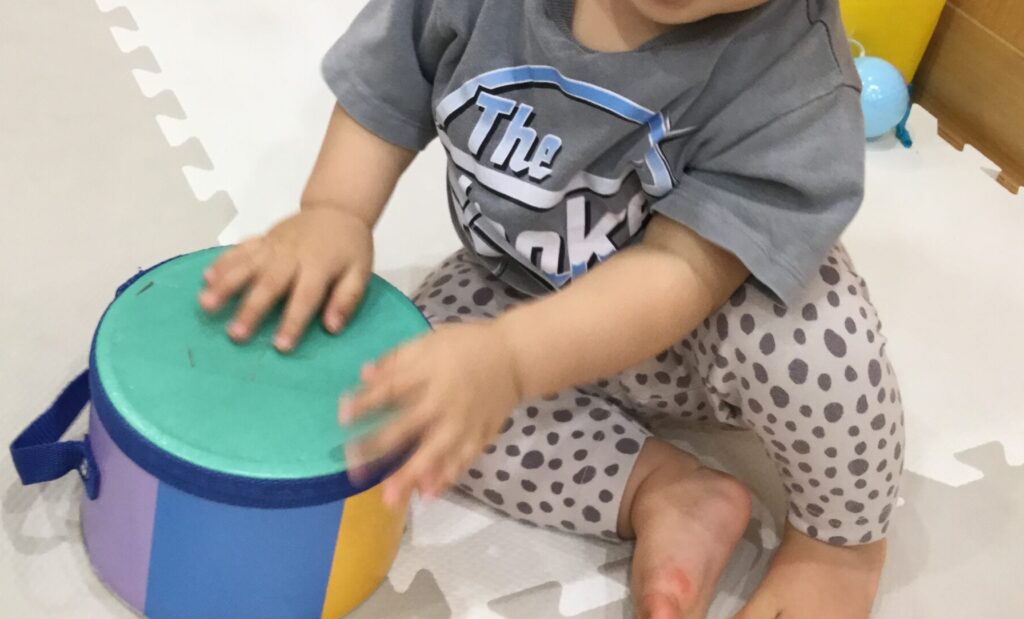 太鼓も好きな玩具の1つです。上手に太鼓を叩いたり、保育者が「おおきなたいこ」の歌を歌うと笑顔でドンドンと叩いたりする姿が可愛らしいです♪