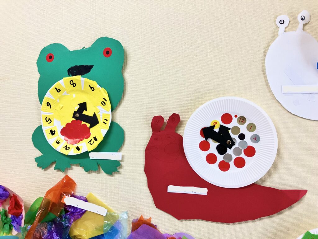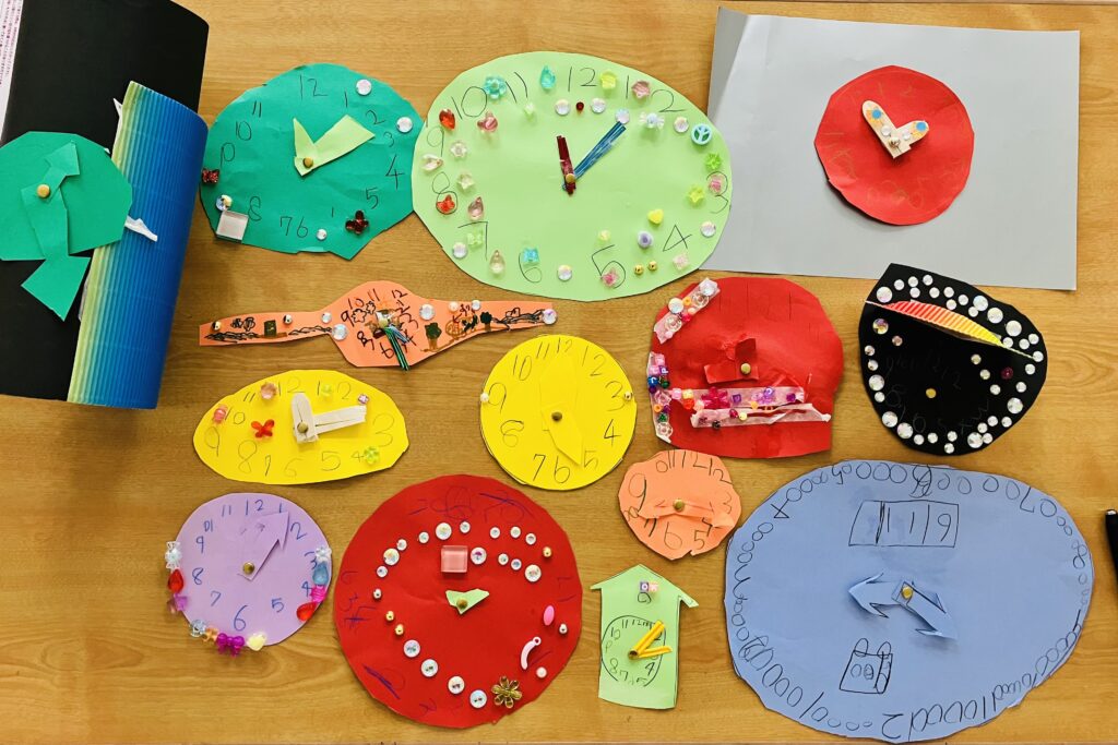また5歳児は時の記念日に合わせて、オリジナルの時計を作りました。様々な素材を使って時針を作っており、子どもの想像力とそれを実現する力にはとても驚かされました。