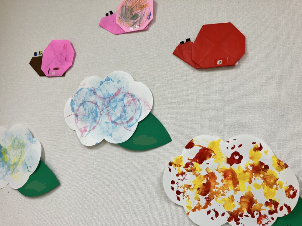 3・4歳児の子どもたちが梅雨の時季の花や生き物等を用いて、室内に飾られた様々な梅雨の生き物の写真から、自由に子どもたちが選んで作りました。