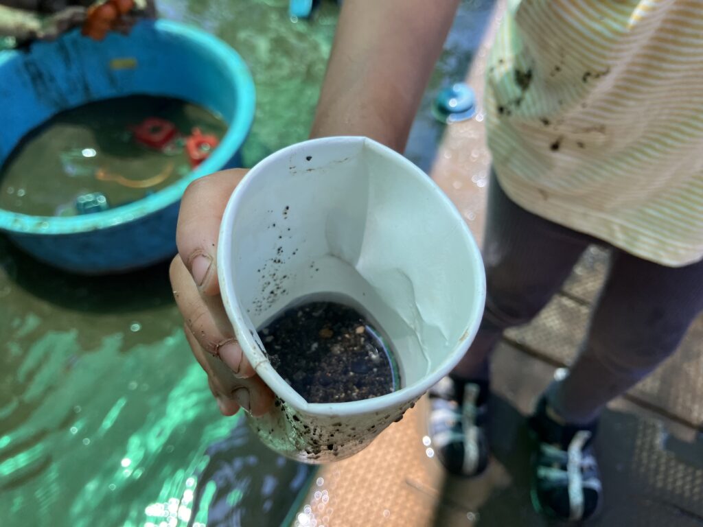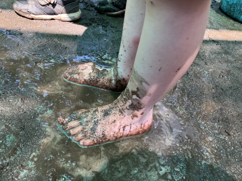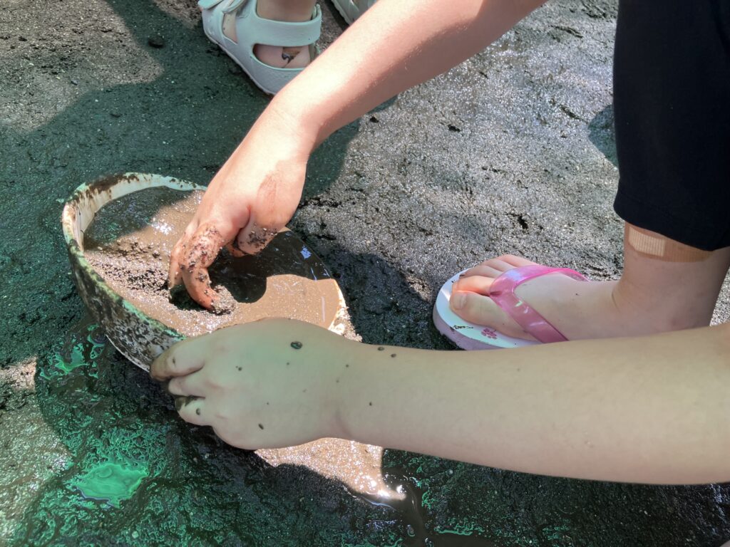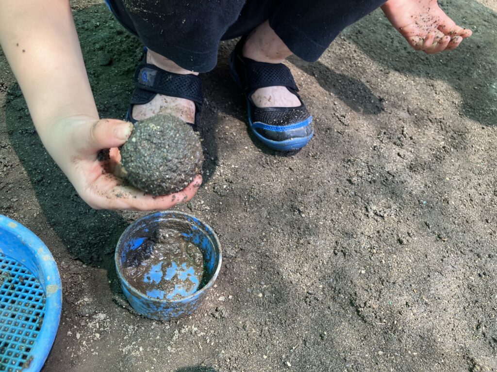 泥は砂と水の配分に応じて、形や粘度、手触りが変わってきます。このように様々な感触を体験できる泥はお子様たちにとってこれ以上ない最高の遊び道具です!自然と泥遊びをしているなかで感覚が研ぎ澄まされて手先の器用さにもつながっていきます。