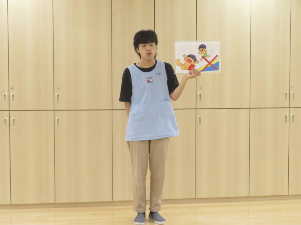 そんな子どもたちと共に始まった集会では、プール遊びが始まること、遊ぶ時のお約束、玩具の使い方などの話をしました。