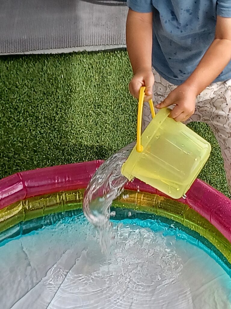 バケツいっぱいにお水をすくって運んでくれます。「いいこと考えた!」と何かひらめいたようです。