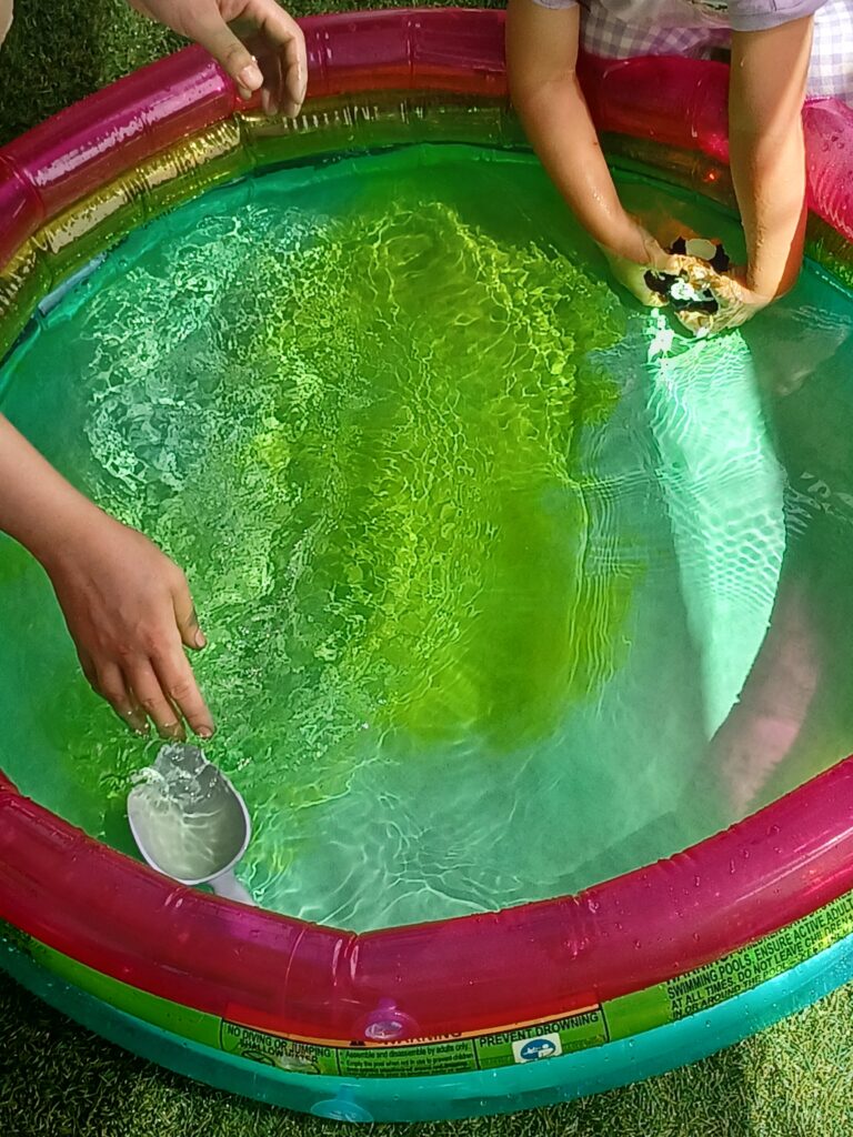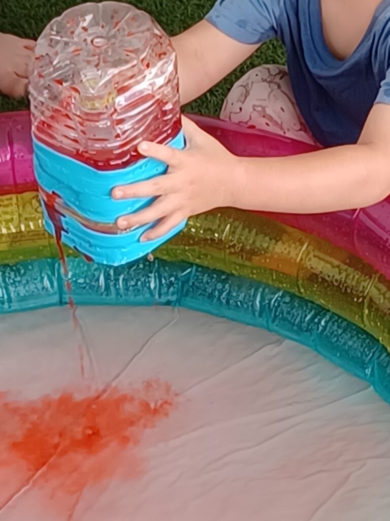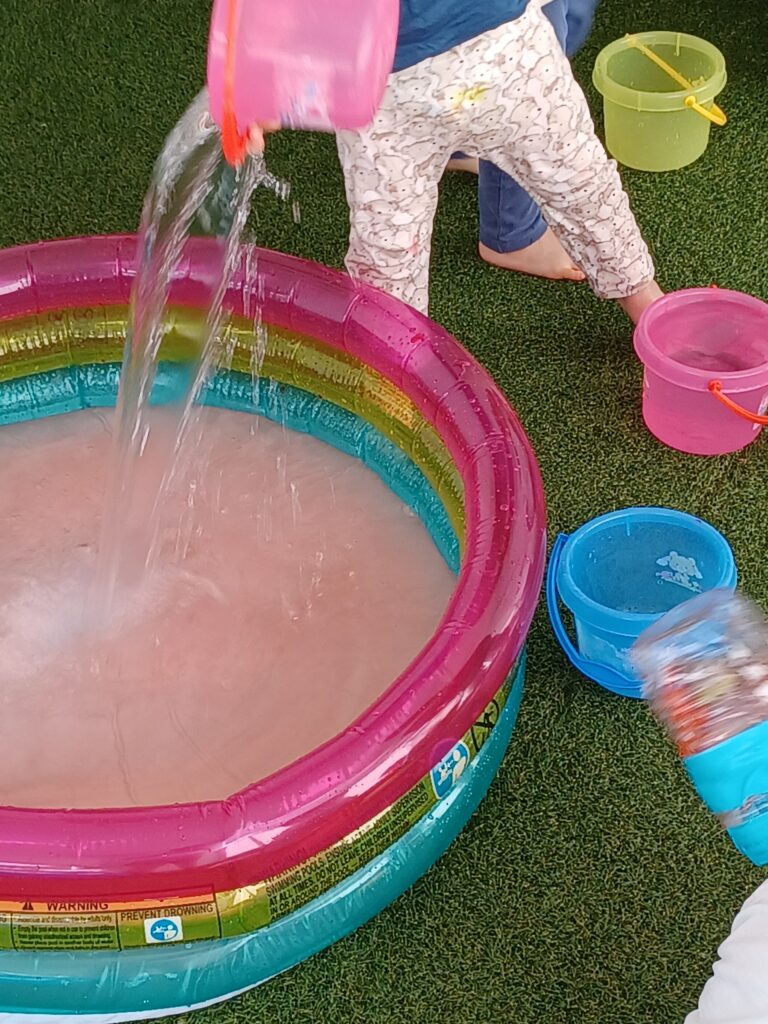 「あ!ピンクになったね!」「じゃあ、もっと水入れなきゃね」と友だちと一緒に今度は水運びが始まりました。