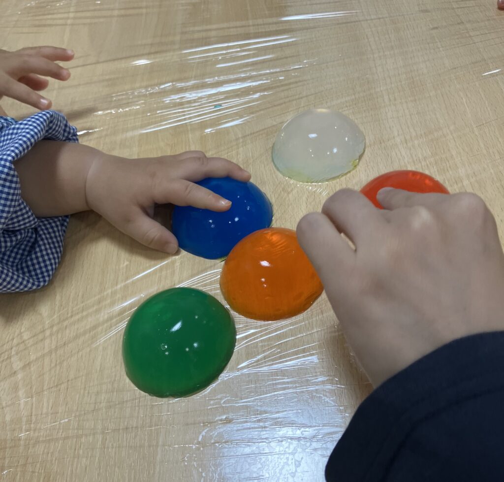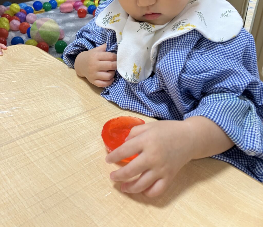 カラフルなゼリーに興味津々!すぐに手を伸ばしてつかもうとしていましたよ。