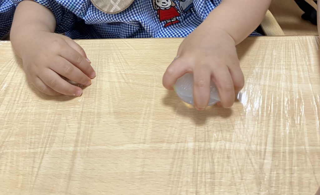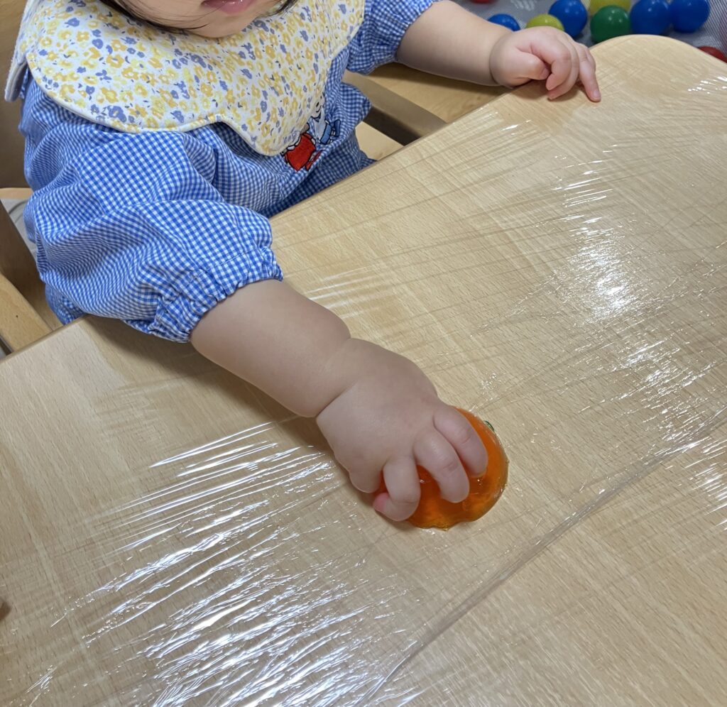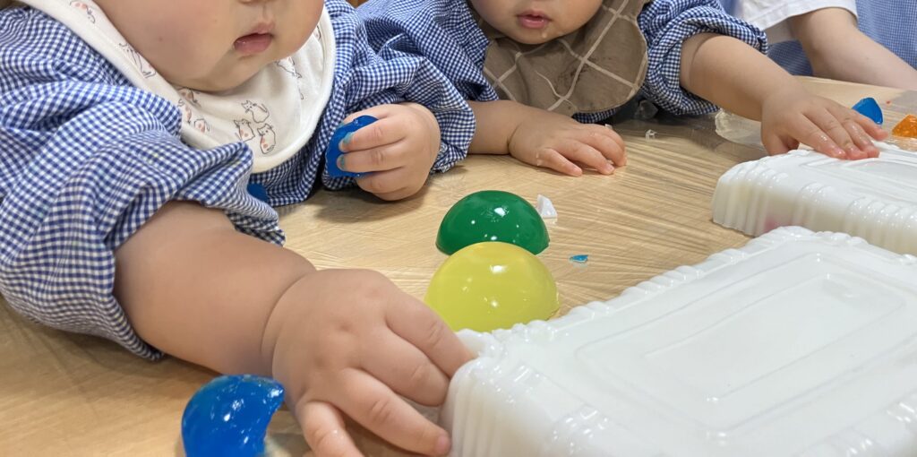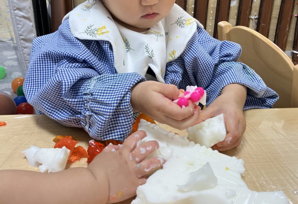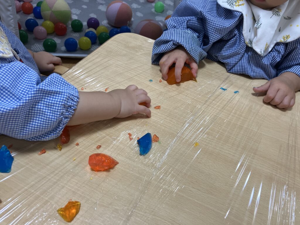 暑い日が続いていますね!0歳クラスで寒天を使ったひんやり感触遊びをしました。