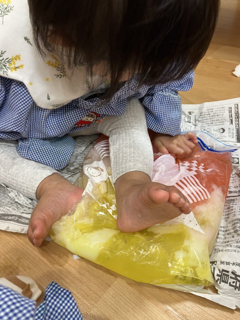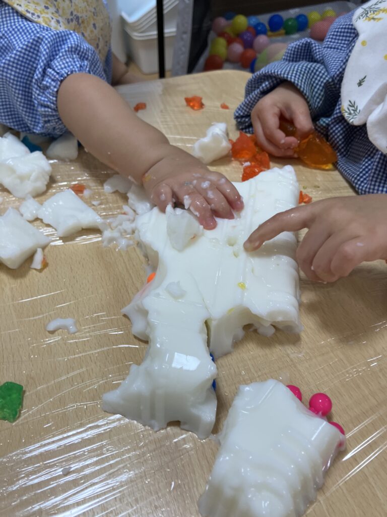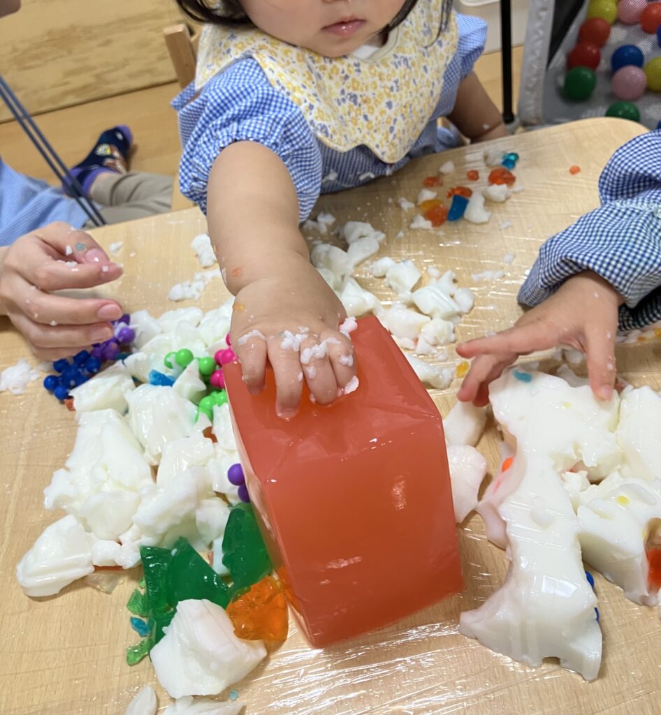 色、形の違った寒天の感触に長時間楽しんで遊ぶ姿が見られました。寒天はゼラチンと違い常温で溶けないのでゆっくりと時間をかけて楽しむことができます。潰して遊んだ後もまた温めて固めれば何度でも遊べるので暑い夏の室内遊びにオススメです♪