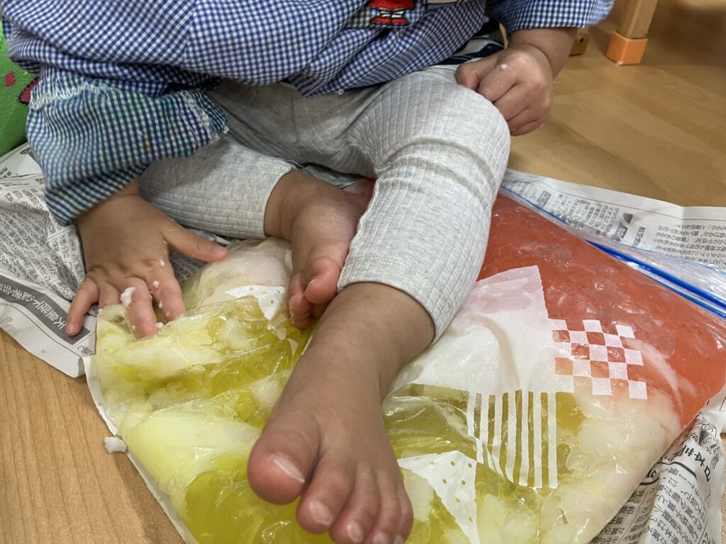 ひんやりしとして気持ちよさそうに座りながらも足を動かして、寒天を潰したり手でつかもうとしていましたよ。