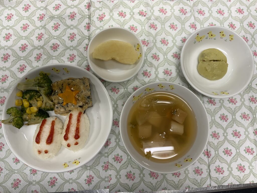 うさぎごはんはケチャップで目と耳を書きました。お月見つくねには星型に切ったにんじんをのせました。