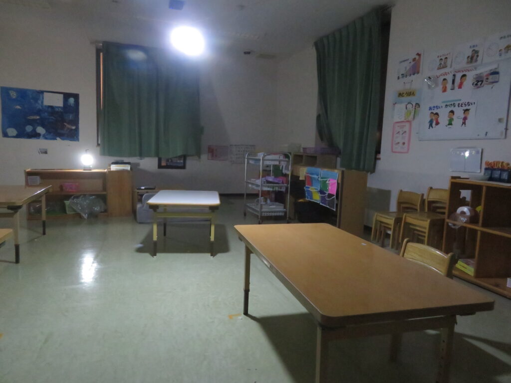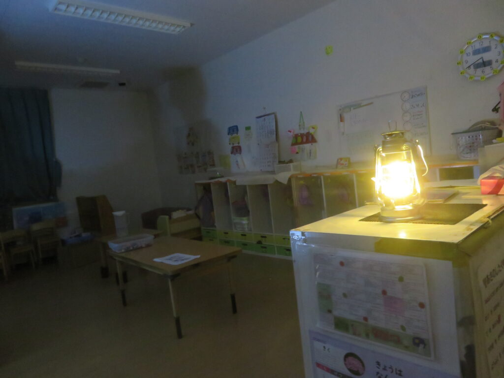停電を想定した薄暗い部屋を、むしろ普段と違うことで幼児クラスの子どもたちは「キャンプみた~い」などとその様子を楽しんでいるようでした。