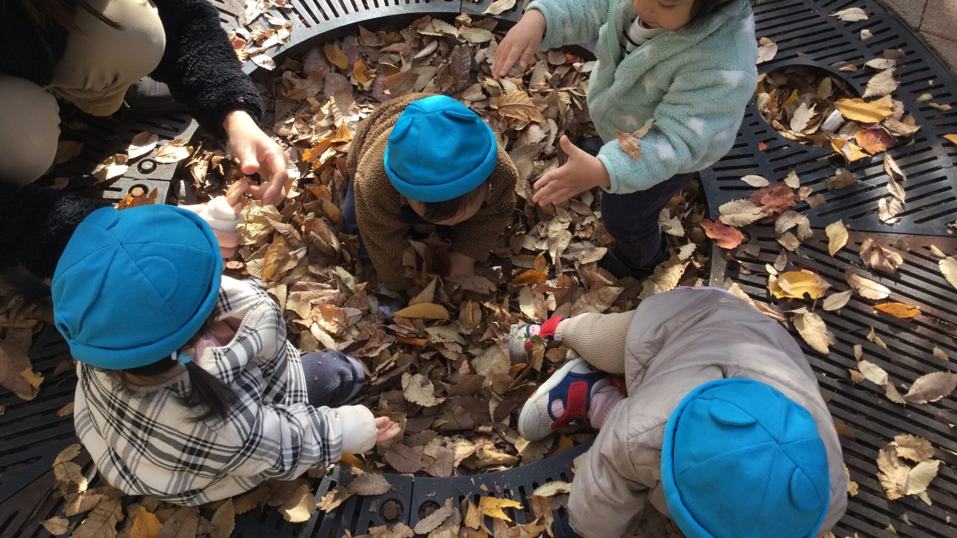 自然物が大好きなひよこ組さん。11月までは落ち葉がなかなか落ちていませんでしたが、12月に入りたくさんの落ち葉が集まっている場所を見つけ、落ち葉遊びの絶好の機会です♬ 落ち葉のたまっている所に入ると、初めはドキドキする様子も見られましたが、保育者が身体や手で触れながら遊ぶ姿を見せると、真似っこをして感触を楽しむ姿が見られました☆