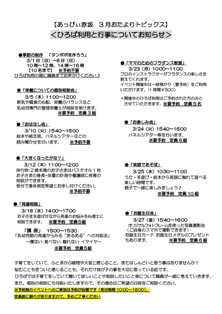 あっぴぃ赤坂の3月のイベントをお知らせします。