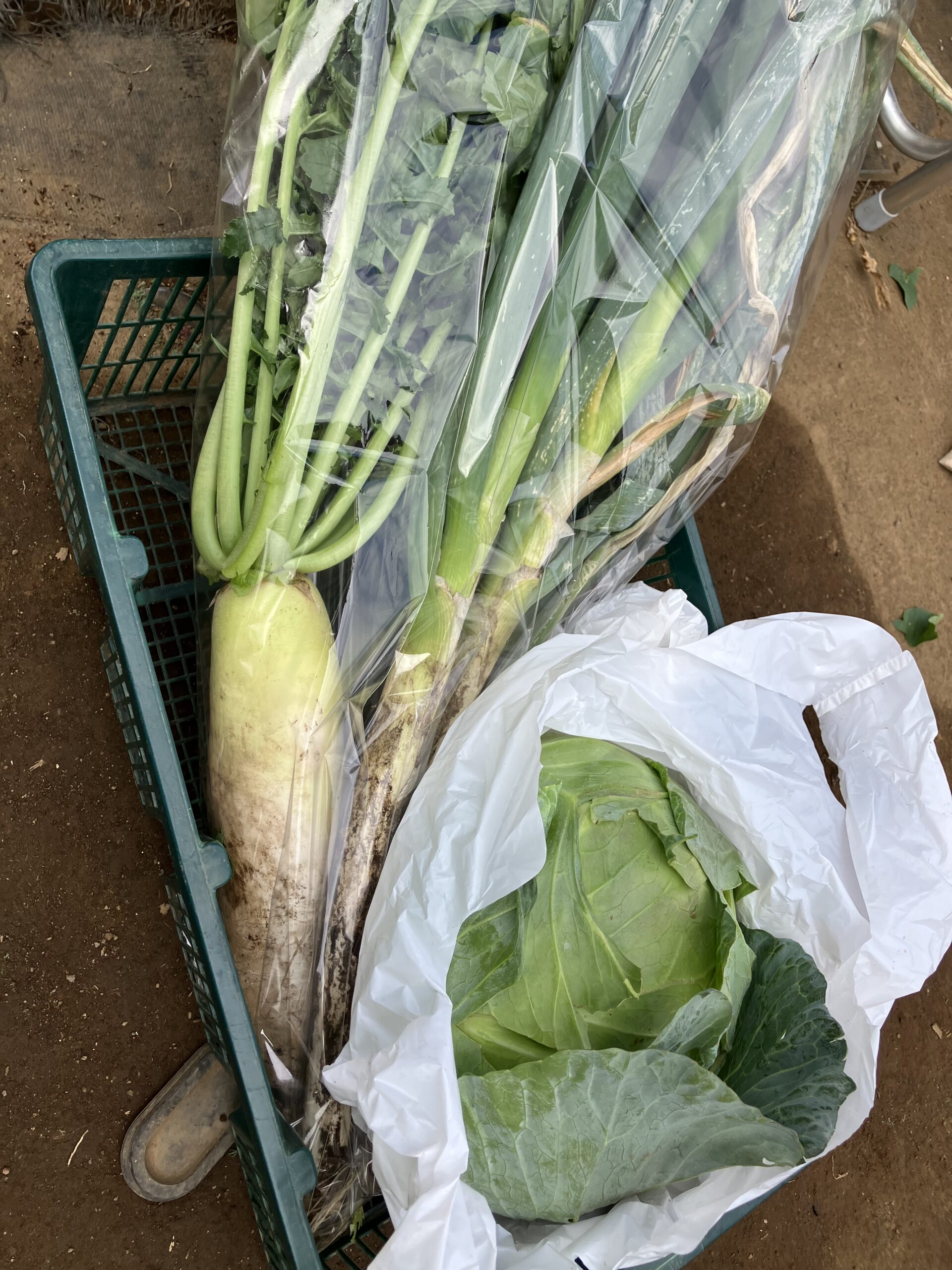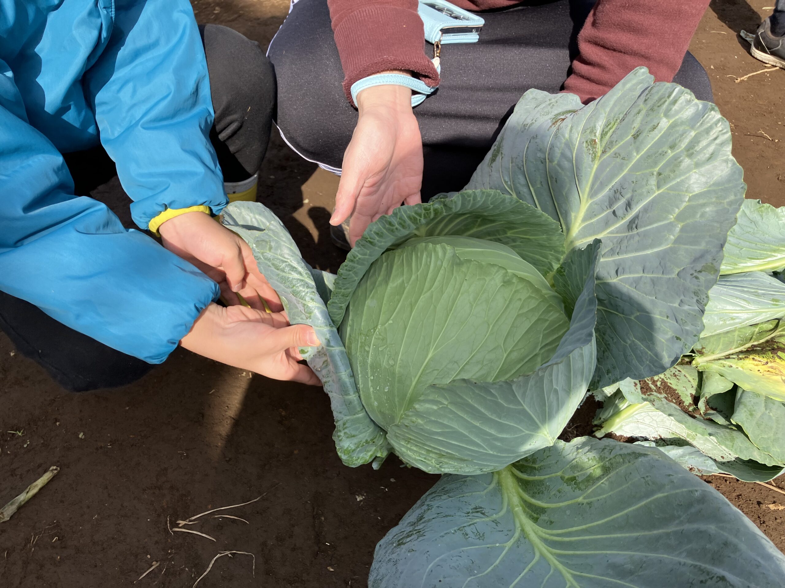 畑では、大根、ネギ、キャベツなどを収穫。大根は立派な葉っぱ付き、キャベツは子どもたちの顔よりもずっと大きく、みんなで「わあ!」と歓声をあげながら収穫を楽しんでいました。
